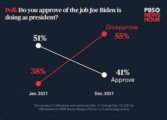 As President Joe Biden heads into the end of the year, he’s facing a sour reality: The number of Americans who approve of his performance has hit a new low. Just 41 percent of Americans approve of the job he has been doing as president, according to a new PBS NewsHour/NPR/Marist poll. Support among independents alone dropped eight points in a week.