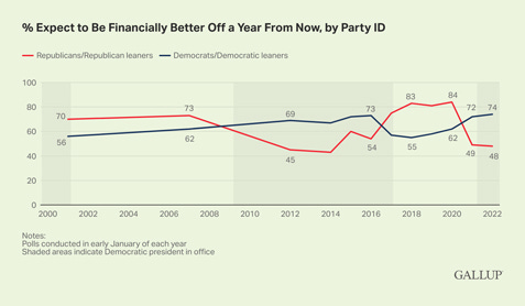 Americans' belief that they are making financial progress has yet to recover after slumping last year. Forty-one percent of U.S. adults now say they are better off financially than a year ago. That is up slightly from 35% in January 2021 but still well below the record-high 59% reporting they were better off in January 2020, right before the start of the coronavirus pandemic.