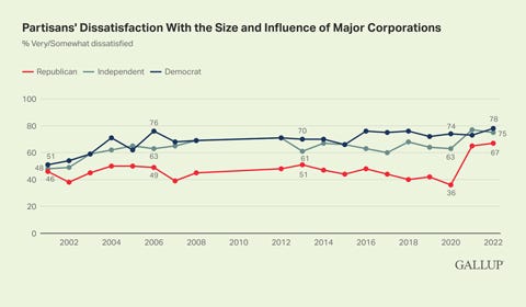 At the end of President Joe Biden's first year in office, Americans' satisfaction with the government's regulation of businesses and industries has fallen eight percentage points to 28%, the lowest point since 2016 when Gallup first began tracking this measure annually. After rising 15 points last year, Americans' dissatisfaction with the size and influence of major corporations is statistically unchanged at 74% but is by one percentage point the highest reading dating back to 2001.