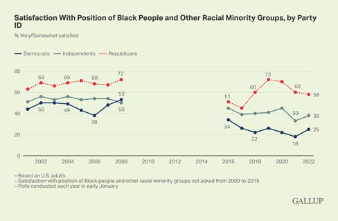 Americans' satisfaction with race-related matters in the U.S. has improved slightly over the past year, although their views remain subdued relative to the past. Forty percent of all U.S. adults are now satisfied with the position of Black people and other racial minority groups, as a whole, and 28% are satisfied with the state of race relations.