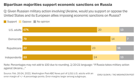 A large and bipartisan majority of Americans supports economic sanctions on Russia for its military invasion of Ukraine, as public antipathy toward Russia climbs to Cold War levels, according to a Washington Post-ABC News poll.