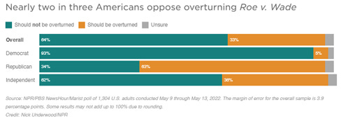 Majority of Americans don’t want Roe overturned Laura Santhanam, PBS NewsHour Most Americans do not support the prospect of the nation’s highest court overturning Roe v. Wade, according to the latest PBS NewsHour/NPR/Marist poll, and public confidence in the Supreme Court is plunging. Most people do not want to permit or ban abortion in all circumstances. Instead, the majority of Americans broadly support abortion with a few exceptions. Two-thirds say don't overturn Roe; the court leak is firing up Democratic voters Domenico Montanaro, NPR News About two-thirds of Americans say they do not support overturning Roe v. Wade, the landmark Supreme Court decision that made abortion legal in the United States, according to the latest NPR/PBS NewsHour/Marist poll. Seven-in-10 U.S. adults, however, say they are in favor of some degree of restrictions on abortion rights.