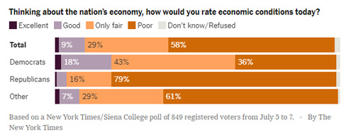 Voters See a Bad Economy, Even if They’re Doing OK Ben Casselman & Lydia DePillis, New York Times [via opiniontoday.com] A New York Times/Siena poll shows remarkable pessimism despite the labor market’s resilience. That could be costly for the Democrats, and the economy.