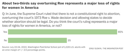 Americans dismayed at end of Roe are less certain they will vote, poll finds Hannah Knowles, Emily Guskin & Scott Clement, Washington Post [via opiniontoday.com] Nearly two-thirds of Americans say the end of Roe v. Wade represents a “major loss of rights” for women, a Washington Post-Schar School poll finds, but those who support abortion access are less certain they will vote this fall — a sign of the challenges facing Democrats who hope the issue will motivate their base in the midterms.