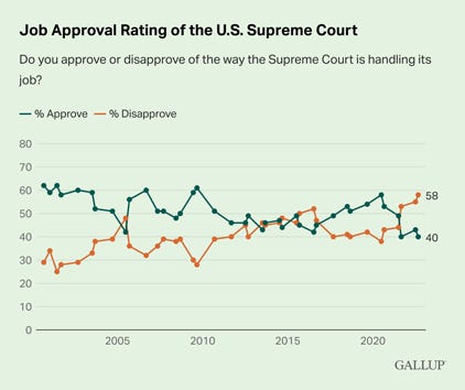 Supreme Court Trust, Job Approval at Historical Lows Jeffrey M. Jones, Gallup Forty-seven percent of U.S. adults say they have "a great deal" or "a fair amount" of trust in the judicial branch of the federal government that is headed by the Supreme Court. This represents a 20-percentage-point drop from two years ago, including seven points since last year, and is now the lowest in Gallup's trend by six points. The new poll also finds a record-tying-low 40% of Americans saying they approve, and a record-high 58% saying they disapprove, of the job the Supreme Court is doing.