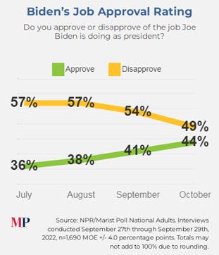 NPR poll shows Biden's approval rating is up but there are warning signs for Democrats Domenico Montanaro, NPR News With just over a month to go in the 2022 midterm elections, Democrats are starting to rally around President Biden, according to the latest NPR/Marist poll.