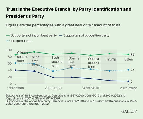 Trust in Federal Government Branches Continues to Falter Jeffrey M. Jones, Gallup Americans continue to lack faith in the federal government, with low levels of trust in all three branches. Trust in federal government branches is largely influenced by the match between a person's political party identification and the controlling party of the institution.