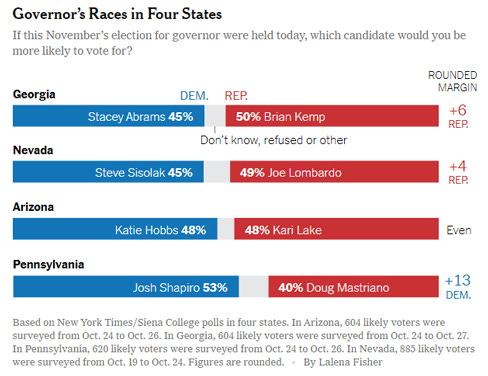 In Close, Crucial Governor’s Races, Poll Finds Sharp Split on Elections Reid J. Epstein & Ruth Igielnik, New York Times [via opiniontoday.com] In Arizona, voters are narrowly divided on whether to elect a prominent Trump-backed election denier. In Pennsylvania, they appear likely to reject a similarly minded Republican.