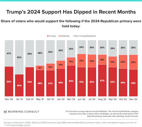 Trump’s GOP Primary Support Has Ebbed Ahead of Potential 2024 Announcement Eli Yokley, Morning Consult New survey reveals the kinds of messages Trump — and his dissenters — can lean on to lure voters not backing him or DeSantis