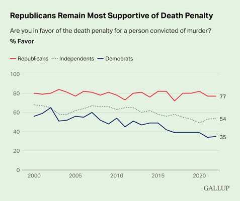 Steady 55% of Americans Support Death Penalty for Murderers Megan Brenan, Gallup The majority of Americans, 55%, are in favor of the death penalty for convicted murderers in the U.S. While this marks the sixth consecutive year that support for capital punishment is between 54% and 56%, it is below the 60% to 80% readings recorded in the four prior decades between 1976 and 2016.