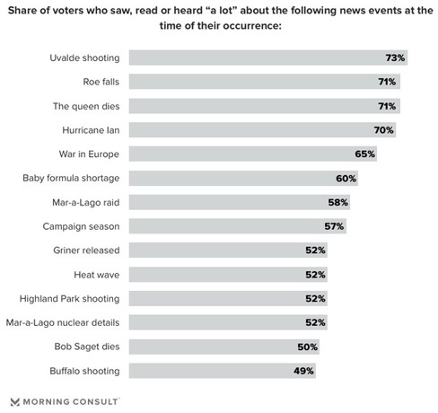 Americans Focus on the Fun Side of the Holidays, But Majority Have Pessimistic Outlook for 2023 Marist Institute for Public Opinion Many Americans are leaving the stressful side of the holiday season behind and are focusing on the fun. In fact, more Americans, compared with 2021, consider the holiday season to be more fun than stressful. Despite the holiday festivities, a majority of Americans have a pessimistic outlook toward the future in 2023. Analyzing the News That Broke Through in 2022 Eli Yokley, Morning Consult Uvalde shooting, Dobbs decision and the queen’s death were the most salient news events of 2022.