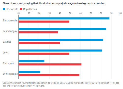 Republicans, Democrats Are Split Over Which Groups Face Discrimination, WSJ Poll Finds Aaron Zitner, Wall Street Journal Partisan lenses help explain emotions driving recent clashes over race, gay rights and religious liberty.
