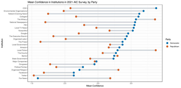 Since 2018, Republicans have lost confidence in U.S. institutions Jonathan Ladd (Georgetown), Sean Kates (Penn) & Joshua Tucker (NYU), Monkey Cage [via opiniontoday.com] The second half of the Trump presidency and beginning of Biden’s term seem to have taken a toll on Republicans’ confidence in U.S. institutions across the board.