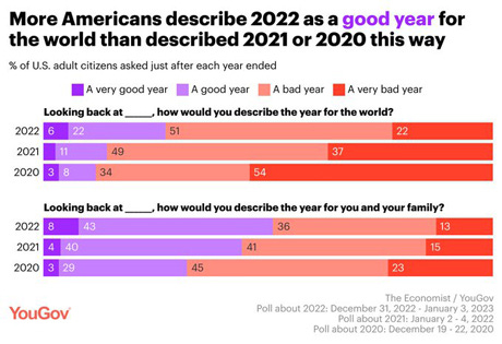 Most Americans say 2022 was a bad year for the U.S., but even more said so about 2020 and 2021 Kathy Frankovic & Taylor Orth, YouGov While most Americans look back on 2022 as a bad year — both for the country and for themselves — this is an improvement over how many viewed 2021 and 2020 the same way when asked at the end of each of those years.