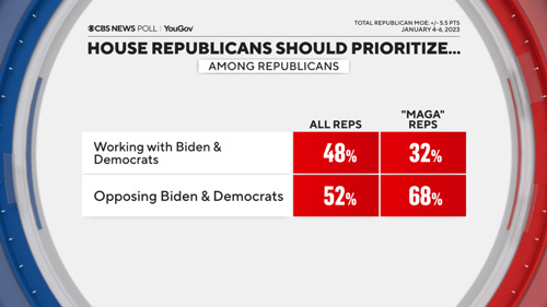 CBS News poll: Inflation, cooperation and…investigation? Americans on what the new Congress should — and shouldn't — deliver Anthony Salvanto, Fred Backus & Jennifer De Pinto, CBS News Inflation remains a concern, and Americans across the political spectrum want Congress to focus on it, amid the usual calls for bipartisanship from most of the nation. We also see splits within the Republicans' rank and file over how to best use their newly minted House majority, through cooperation or investigation, and on the impact of "MAGA" Republicans.