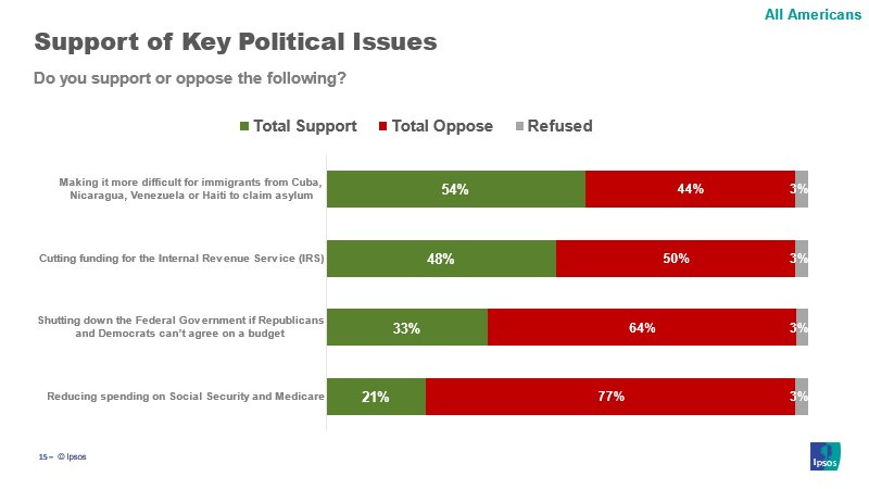 As debt battle looms, 55% of Americans say GOP House is 'dysfunctional' Andrew Romano, Yahoo News By a massive 30-point margin, Americans say Republicans’ protracted battle earlier this month to elect a new House speaker is a sign that “Congress is dysfunctional” (55%) rather than “functioning as intended” (25%), according to a new Yahoo News/YouGov poll. Ipsos Core Political Survey Chris Jackson & Annaleise Azevedo Lohr, Ipsos President Biden’s approval rating remains at 40% this week. When asked about other leaders, Americans are most likely to disapprove of Senate Minority Leader Mitch McConnell (53%), followed by Speaker of the House Kevin McCarthy (42%). A majority of Americans support making it more difficult for immigrants from Cuba, Nicaragua, Venezuela, and Haiti to claim asylum (54%), and they are least likely to support reducing spending on Social Security and Medicare (21%).