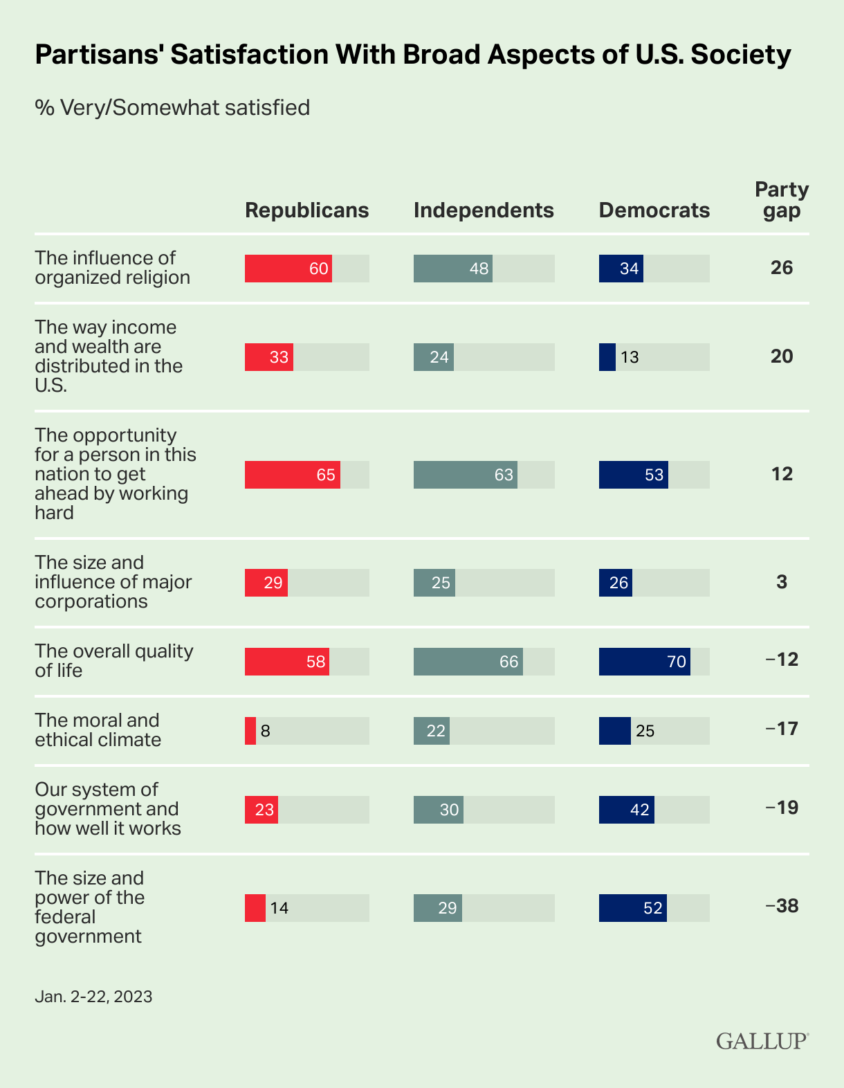 Americans Still Glum About State of the Union in Most Areas Lydia Saad, Gallup Americans’ assessment of the state of the nation remains in the pandemic-era slump seen since 2021, marked by subdued satisfaction with 30 different aspects of the country. These include the public’s reaction to several aspects of U.S. society generally, as well as to numerous specific issues facing the country.