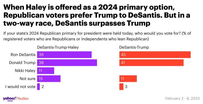 DeSantis leads Trump for 2024 GOP nod — but not if Haley and others split the vote Andrew Romano, Yahoo News The Florida governor edges out Trump and performs better against Biden in head-to-head matchups.
