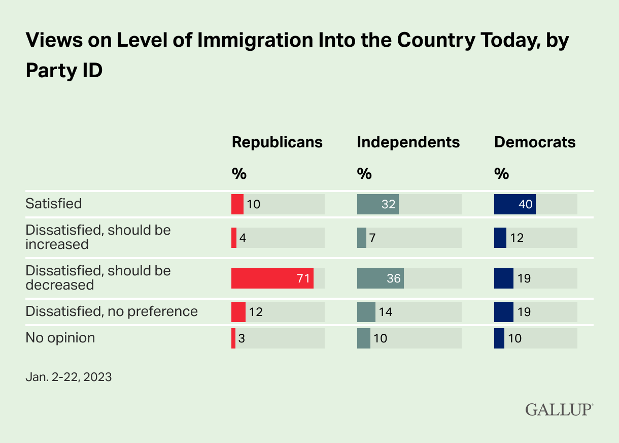 Americans Showing Increased Concern About Immigration Lydia Saad, Gallup Americans’ satisfaction with the level of immigration into the U.S. has fallen six percentage points over the past year, from 34% in January 2022 to 28% today. This is the lowest reading in a decade.