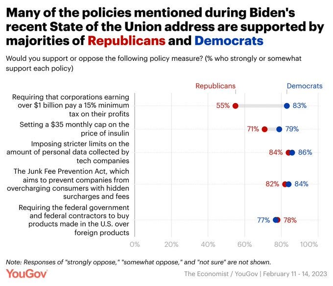 Trump Has Slight Lead Over DeSantis In GOP Primary Quinnipiac University Poll Given a list of 14 names of Republicans who either have said they are running for president in 2024 or are seen as potential candidates in a Republican primary, Trump receives 42% among Republican and Republican leaning voters followed by DeSantis who receives 36%. In a hypothetical general election matchup, it is a toss-up between Biden (48%) and Trump (46%) among all registered voters. It is also a toss-up between Biden and DeSantis, with 47% supporting DeSantis and 46% supporting Biden. Many policies Biden raised in his State of the Union address are supported by bipartisan majorities Taylor Orth & Kathy Frankovic, YouGov Several parts of the president’s agenda articulated in his State of the Union speech are supported by large majorities. And all five of the policies polled are supported by majorities in each major party.