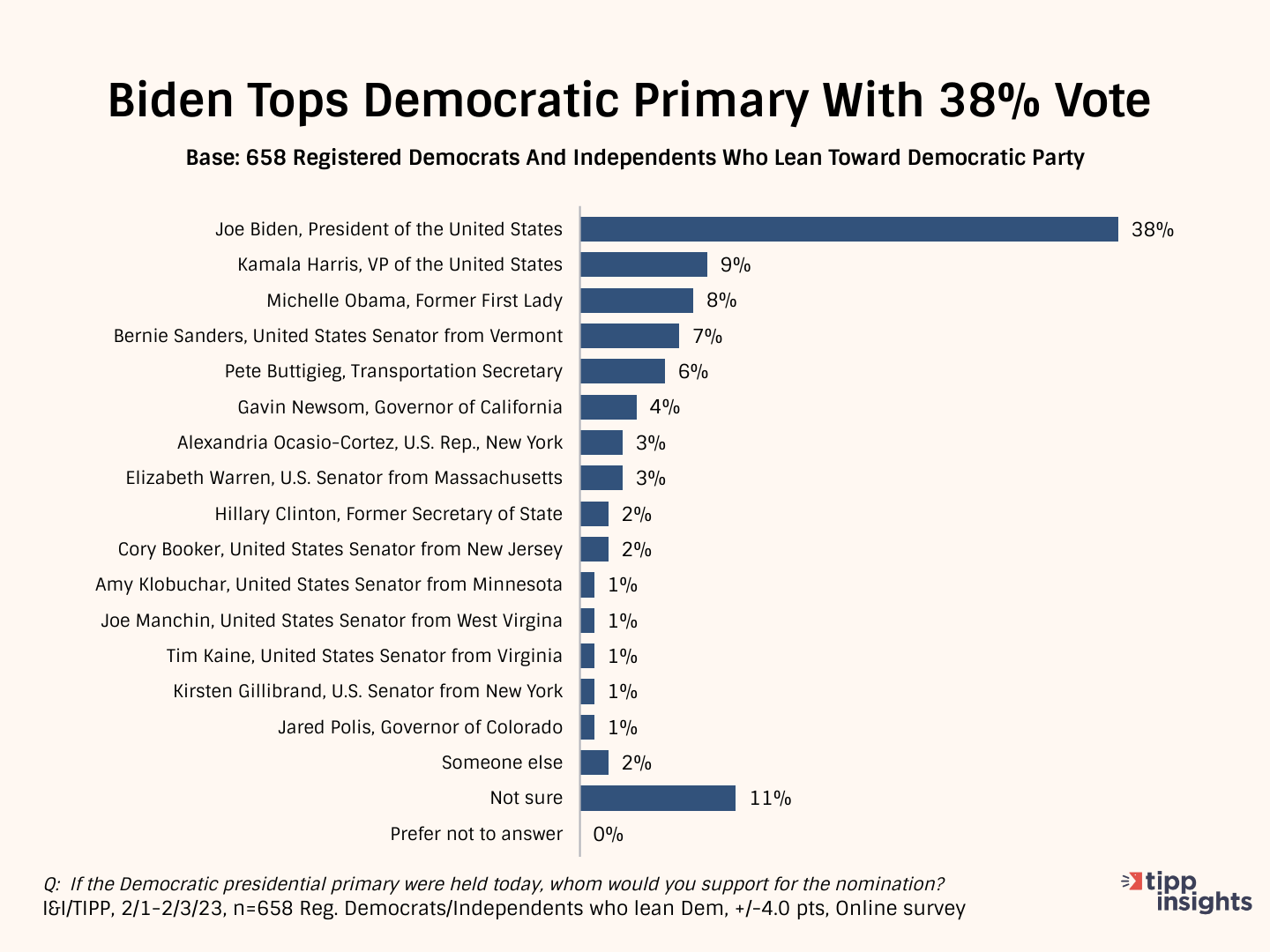 I&I/TIPP: Trump leads DeSantis in GOP primary; just 38% of Democrats support Biden Terry Jones, tippinsights Half of GOP primary voters said they would support Trump, compared to 27% who would support DeSantis. No other major candidate even broke into double digits. Just 38% of Democrats say they will support Biden, leaving open the possibility of a breakthrough candidacy of one or more challengers.