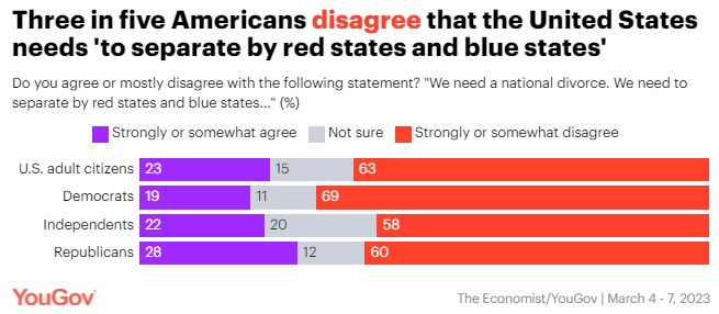 Most Americans do not want a national divorce of red and blue states Linley Sanders & Kathy Frankovic, YouGov Republican House Representative Marjorie Taylor Greene suggested on Twitter that the United States should have a “national divorce” that separates red states from blue states. That idea of splitting the country by which party controls each state's government does not get a lot of support in the latest Economist/YouGov poll: Majorities of Democrats (69%) and Republicans (60%) disagree with Greene's suggestion.