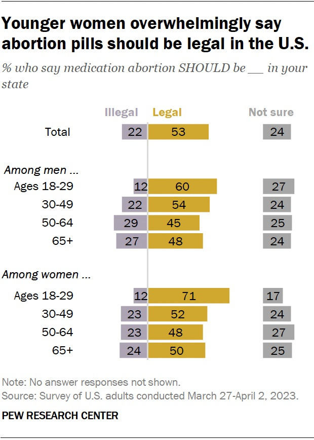 By more than two-to-one, Americans say medication abortion should be legal in their state Hannah Hartig, Pew Research Center With the future of abortion pills in legal jeopardy, more Americans say medication abortion should be legal than illegal in their state, according to a new Pew Research Center survey. The survey – conducted in the days before the conflicting court rulings on medication abortion by federal judges in Texas and Washington state – also finds stark divides by age and partisanship in Americans’ views of the issue.