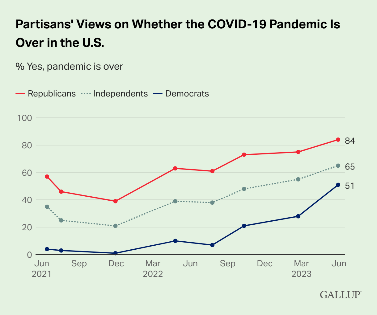 Most Now Say Pandemic Is Over, but Normalcy Remains Elusive Megan Brenan, Gallup For the first time in the three-plus years since the COVID-19 pandemic began, a majority of Americans say it is over. Worry about contracting the disease has also fallen to a near-record low point. Yet, for all of this positivity, the public remains divided over whether their lives are back to normal.
