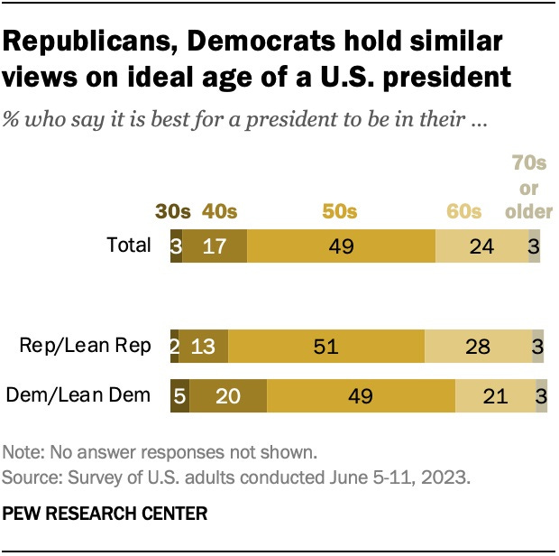 About half of Americans say the best age for a U.S. president is in their 50s Katy Lin & Amina Dunn, Pew Research Center When asked about the ideal age of a president, around half of Americans (49%) say they prefer someone in their 50s, according to a recent Pew Research Center survey.