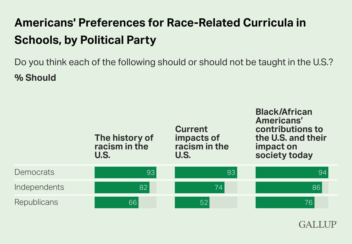 There's still time to take advantage of our 4th of July sale. If you'd like to continue to receive the full Opinion Today daily briefing, and you're not yet a paid subscriber, sign up today using the link below and get a 25% discount:Majorities Support Racial Education in U.S. Schools Andrea Malek Ash, Gallup Amid discussions across the U.S. about the inclusion of race and racism in K-12 curricula, broad majorities of Americans think the current impacts of racism and race-related history topics should be taught in U.S. schools.