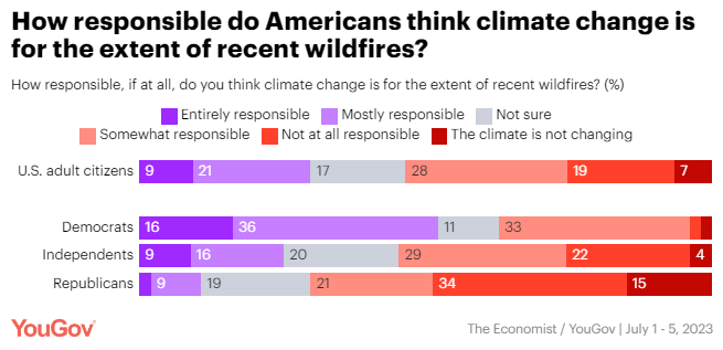 Four in 10 Americans say their air quality is currently being affected by wildfires Taylor Orth, Kathy Frankovic & Carl Bialik, YouGov When Canadian wildfires were affecting many Americans' air quality last month, about one-third said their air quality had been affected by wildfires, including a much higher share in the Northeast. The recent Canadian fires have had an even broader reach, the latest Economist/YouGov poll finds: 42% of Americans now say their air quality has been affected, including at least 70% in both the Midwest and Northeast.