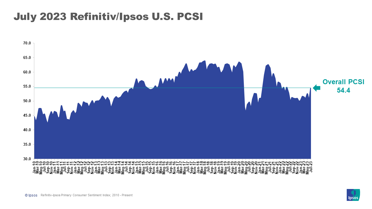 July 2023 Refinitiv/Ipsos Primary Consumer Sentiment Index Ipsos The Refinitiv/Ipsos Primary Consumer Sentiment Index for July 2023 is at 54.4. Fielded from June 23 - July 7, 2023, the Index has gained 4.8 points since last month. After falling to its lowest point of the year in June amid uncertainty over the debt ceiling, the Index has now risen to its highest point since May 2022 (54.7).