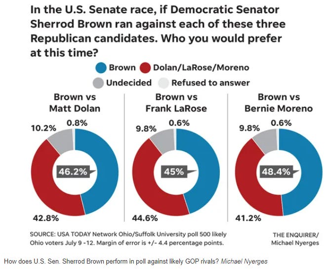 The Liberal Patriot/YouGov poll: Democrats Face Some Political Vulnerabilities on Foreign Policy Brian Katulis & Peter Juul, The Liberal Patriot Biden has a steadier hand on foreign policy than his predecessor, but this doesn’t translate into a political advantage on key national security questions. Trump, Biden Still Hold Big Leads, But Can It Last? I&I/TIPP Poll Terry Jones, tippinsights Both of the leading candidates for president in 2024 have come under intense scrutiny and political pressure in recent weeks, but it hasn't dimmed their prospects much. Young Americans blame SCOTUS, GOP for unforgiven student loan debt April Rubin, Axios Young Americans are piling the blame for their student debt balances on conservatives, according to a poll by Generation Lab provided exclusively to Axios. 30% Say They’ll Watch/Follow Women’s World Cup Soccer Tournament Michael Ricciardelli, Seton Hall Sports Poll The Women’s World Cup is set to begin on Thursday. A Seton Hall Sports Poll found that 30 percent of Americans surveyed will watch or follow FIFA’s 32-nation soccer tournament – a number that grows to 46 percent among sports fans and 65 percent among avid sports fans. Sixty-seven percent of those who identify as soccer fans say they will be following the tournament. Ohio voters are backing Donald Trump; Sen. Sherrod Brown in tight race in 2024 Haley BeMiller, Cincinnati Enquirer Sen. Sherrod Brown maintained a slight edge over his potential Republican opponents as he heads into a contentious reelection bid, according to a new USA TODAY Network/Suffolk University poll. The same survey showed Ohioans once again supporting former President Trump over President Biden in a 2024 rematch.
