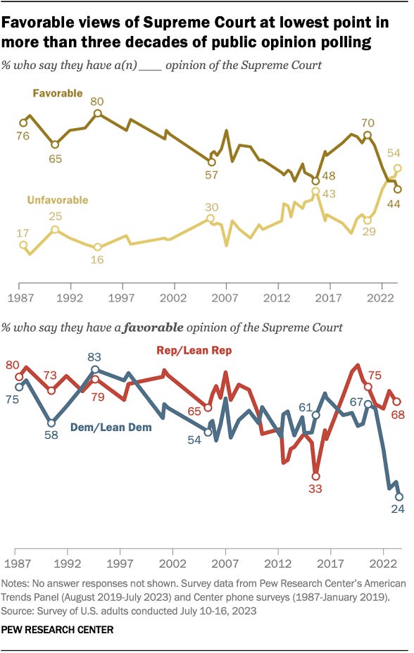 Trump voters say racism against white Americans is a bigger problem than racism against Black Americans Marquise Francis & Andrew Romano, Yahoo News As public support for reparations for African Americans remains stubbornly low, a new Yahoo News/YouGov poll reveals one major roadblock: Donald Trump voters believe that racism against white Americans has become a bigger problem than racism against Black Americans. Favorable views of Supreme Court fall to historic low Katy Lin & Carroll Doherty, Pew Research Center Following a series of high-profile rulings addressing such issues as affirmative action, LGBTQ rights and student loans, the share of Americans with a favorable opinion of the U.S. Supreme Court has declined to its lowest point in public opinion surveys dating to 1987.