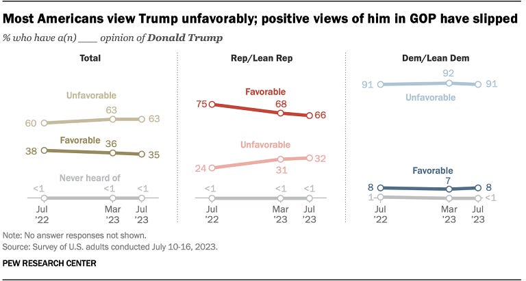 Little change in Americans’ views of Trump over the past year Andy Cerda, Pew Research Center Trump remains broadly unpopular with the public: 63% of Americans have an unfavorable opinion of the former president, while 35% view him favorably. A year ago, Trump’s rating stood at 60% unfavorable. The public’s views of four other political leaders included in the survey, including President Biden, also continue to be more unfavorable than favorable.