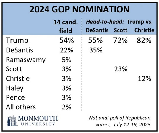 DeSantis Message Falls Flat Monmouth University Polling Institute A majority of Republican voters say Trump would be their strongest nominee in the 2024 election and few feel the criminal indictments he faces are of any concern. DeSantis’ efforts to paint himself as both a stronger candidate and a more effective leader than Trump have largely failed to connect with the GOP electorate.