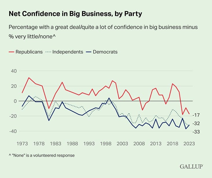Republican Confidence in Big Business Remains Scarce Lydia Saad, Gallup After nearly a half century when Republicans routinely viewed big business in a more positive than negative light, their perspective shifted to being more skeptical of it in 2021 and remains that way in 2023. A record-low 18% of Republicans now say they have a “great deal” or “quite a lot” of confidence in big business, whereas nearly twice as many -- 35% -- report having “very little” or no confidence in it.