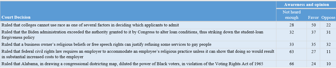 National survey finds four-point increase in overall public approval of U.S. Supreme Court’s performance and plurality support of five recent major decisions Marquette Law School Poll A new Marquette Law School Poll national survey finds that 45% of adults approve of the job the U.S. Supreme Court is doing and 55% disapprove. Each of five decisions released in June 2023 and included in the survey found a plurality of support, with at least two-thirds awareness in cases involving race in college admissions, student-loan forgiveness, and religious beliefs and free speech.