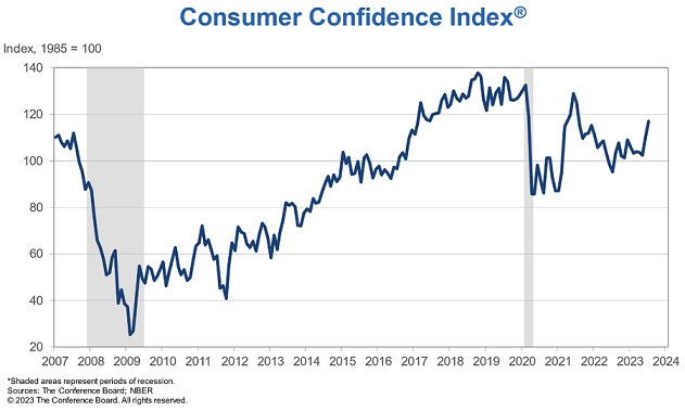 Consumer Confidence Stands at Highest Level since July 2021 Conference Board The Conference Board Consumer Confidence Index® rose again in July to 117.0 (1985=100), up from 110.1 in June. “Consumer confidence rose in July 2023 to its highest level since July 2021, reflecting pops in both current conditions and expectations,” said Dana Peterson, Chief Economist at The Conference Board.