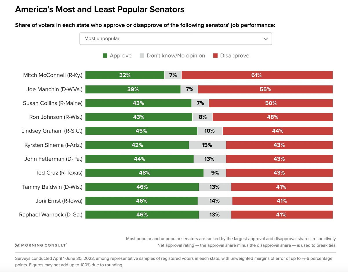 Can the Race Really Be That Close? Yes, Biden and Trump Are Tied. Nate Cohn, New York Times Despite the stop-the-steal movement, the Supreme Court’s decision to overturn Roe v. Wade and the numerous investigations facing Trump, Biden and Trump are still tied, each at 43 percent, among registered voters in our first Times/Siena poll of the 2024 election cycle. To the extent the survey suggests a slightly closer race than four years ago, it appears mostly attributable to modest Trump gains among Black, Hispanic, male and low-income voters. U.S. Senator Rankings: Manchin, Sinema Are Among America’s Least Popular Ahead of Potential Campaigns Eli Yokley, Morning Consult 55% of West Virginia voters disapprove of Manchin, while 43% of Arizonans have negative views of Sinema