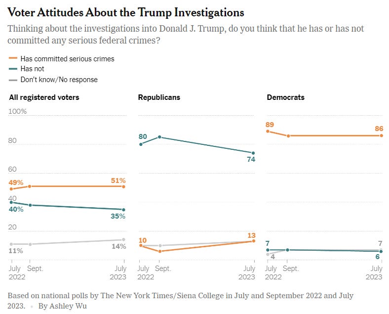More Republicans Say Trump Committed Crimes. But They Still Support Him. Ruth Igielnik & Maggie Haberman, New York Times The share of Republicans saying the former president has committed “serious federal crimes” has grown modestly, according to a new poll from The New York Times and Siena College.