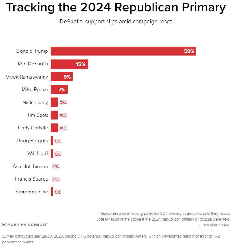 Trump maintains a formidable lead Eli Yokley, Morning Consult With 58% backing, Trump leads DeSantis by 43 percentage points among potential GOP primary voters, marking one of the former president’s largest advantages over his nearest challenger since we began tracking the presidential race in early December.
