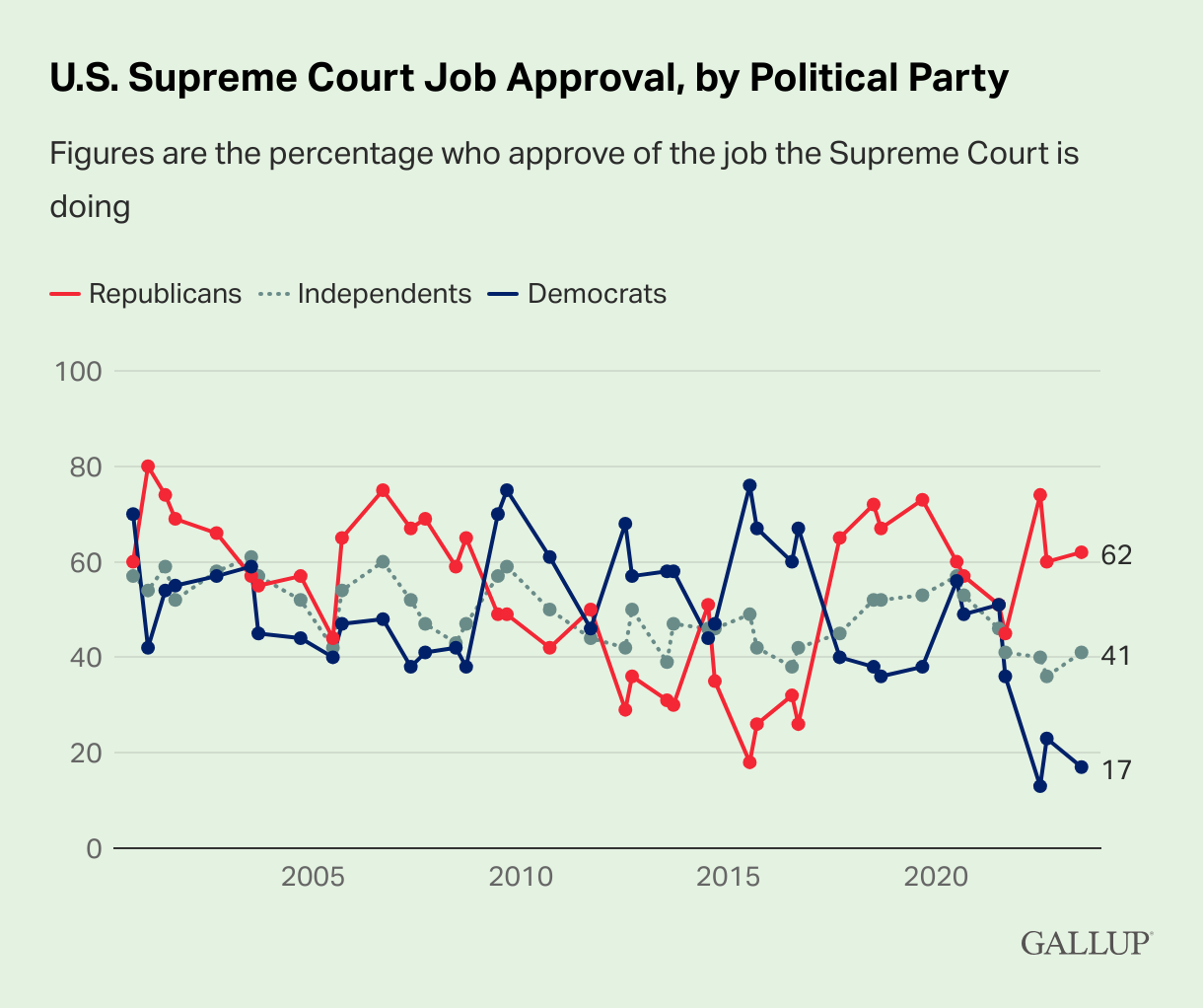 Supreme Court Approval Holds at Record Low Jeffrey M. Jones, Gallup The U.S. Supreme Court’s eventful 2022-2023 term appears to have had no effect on Americans’ overall opinion of the high court, with its 40% approval rating the same as Gallup found last September, just before the start of the term.
