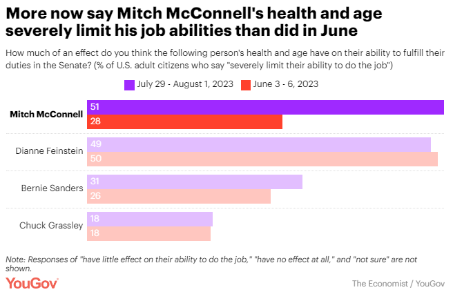 A growing share of Americans say Mitch McConnell's health and age severely limit his abilities Kathy Frankovic, Taylor Orth & Carl Bialik, YouGov Americans continue to see age as a problem for U.S. political leaders — especially for President Biden. Following Mitch McConnell's recent public health episode, the share of Americans who say the effects of his health and age on his abilities are severe has increased dramatically.