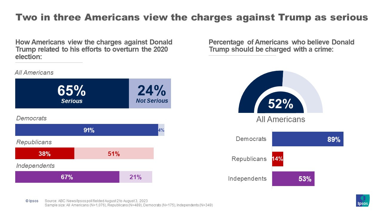 Americans divided on January 6th indictment, in line with other criminal cases against Trump Ipsos New ABC News/Ipsos polling finds that most Americans believe the charges against former President Trump in the January 6th case are serious, though there are significant differences by partisanship.