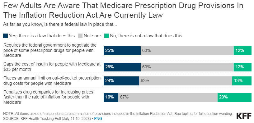 Nearly two-thirds of Americans think Jan. 6 charges against Trump are serious Tal Axelrod, ABC News A majority of Americans (51%) think Tuesday's federal indictment of former President Trump related to Jan. 6 and his efforts to overturn the 2020 election is very serious, marking the highest figure yet of the three indictments he's faced, according to a new ABC News/Ipsos poll. CNN Poll: Majority of Americans oppose more US aid for Ukraine in war with Russia Jennifer Agiesta, CNN Most Americans oppose Congress authorizing additional funding to support Ukraine in its war with Russia, according to a new CNN poll conducted by SSRS, as the public splits over whether the US has already done enough to assist Ukraine. Few Aware of Medicare Drug-Price Provisions Included in Inflation Reduction Act KFF Nearly a year after President Biden signed the Inflation Reduction Act into law, relatively few people are aware of its provisions aimed at lowering prescription drug costs in Medicare. For example, a quarter of the public are aware that there’s a law requiring the federal government to negotiate some drug prices for people with Medicare (25%); capping insulin costs for people with Medicare (25%); and placing an annual limit on Medicare enrollees’ out-of-pocket drug costs (24%).