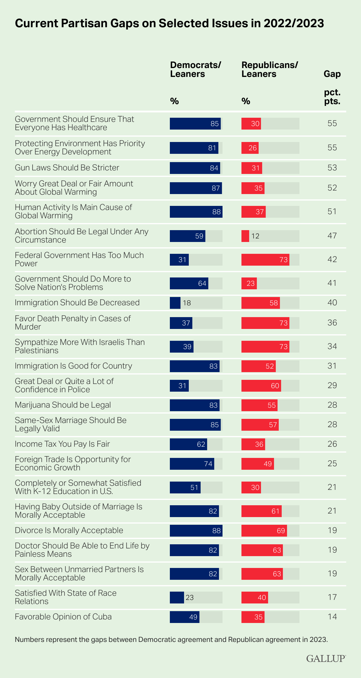Partisan Gaps Expand Most on Government Power, Climate Frank Newport, Gallup Political polarization since 2003 has increased most significantly on issues related to federal government power, global warming and the environment, education, abortion, foreign trade, immigration, gun laws, the government’s role in providing healthcare, and income tax fairness. Increased polarization has been less evident on certain moral issues and satisfaction with the state of race relations.