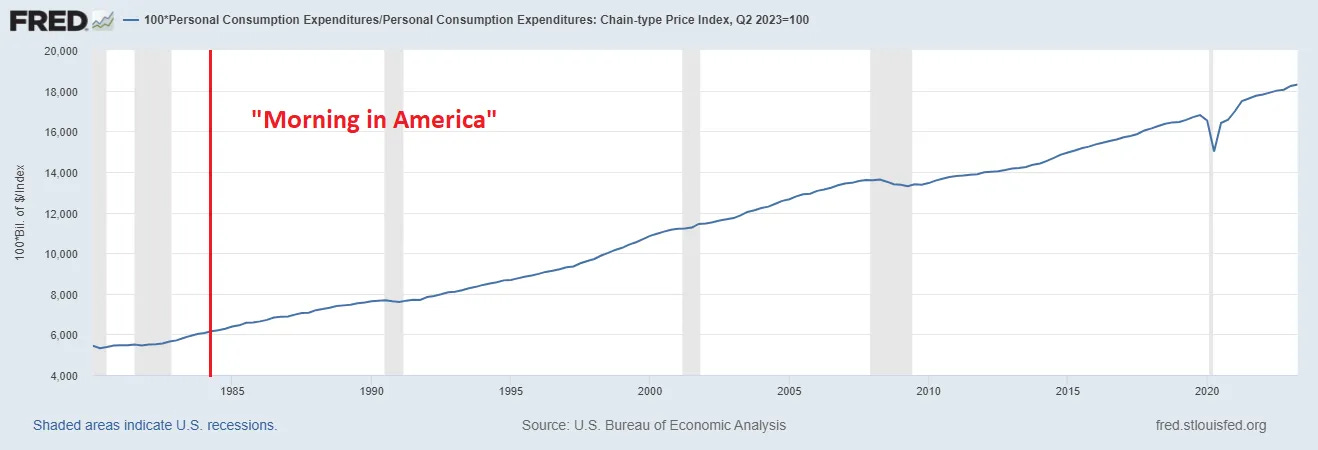 Are we better off? Comparing "Morning in America" with 2023 Noah Smith, Noahpinion Judging Biden’s economy by the things that Reagan’s campaign thought he was getting right in 1984 is actually a pretty tough standard. Nevertheless, 2023 actually comes out ahead on most counts. Reagan’s "Morning in America" ad trumpets five things: 1. High employment rates. 2. Lower interest rates. 3. Lower inflation. 4. Lots of homebuying. 5. A large number of marriages. So let’s do a little comparison.