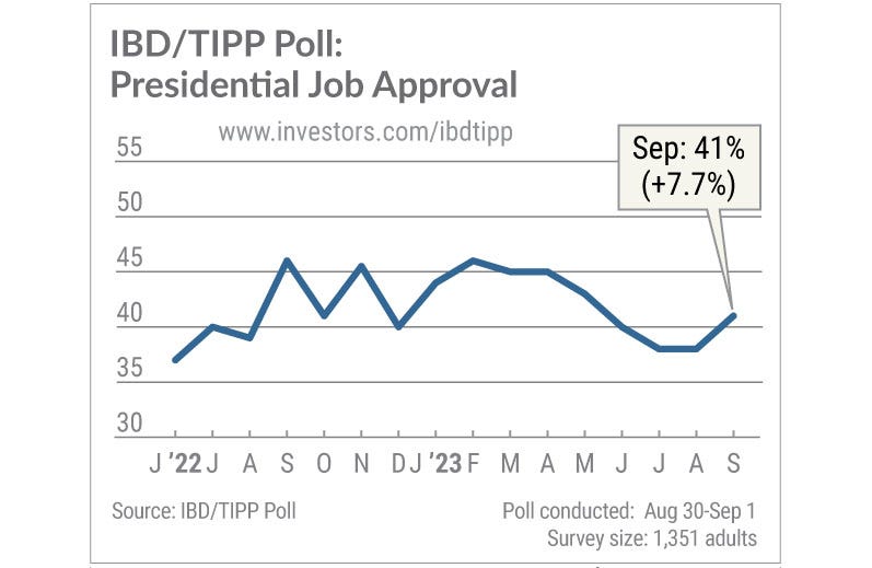 CNN Poll: GOP voters’ broad support for Trump holds, with less than half seriously worried criminal charges will harm his 2024 chances Jennifer Agiesta & Ariel Edwards-Levy, CNN Former President Trump continues to hold what has proven to be an unshakeable position atop the Republican field of candidates vying to take on President Biden next year, according to a new CNN poll conducted by SSRS. Biden Approval Rating Bounces, Thanks To Investors, Amid S&P 500 Rally Jed Graham, Investor’s Business Daily The September IBD/TIPP Poll shows 41% of Americans age 18 and up approve of how Biden is handling the presidency, and 49% disapprove. Biden's net-approval rating of -8 points follows two months at -13 points. Biden's approval among investors surged to 56%-40% in September.