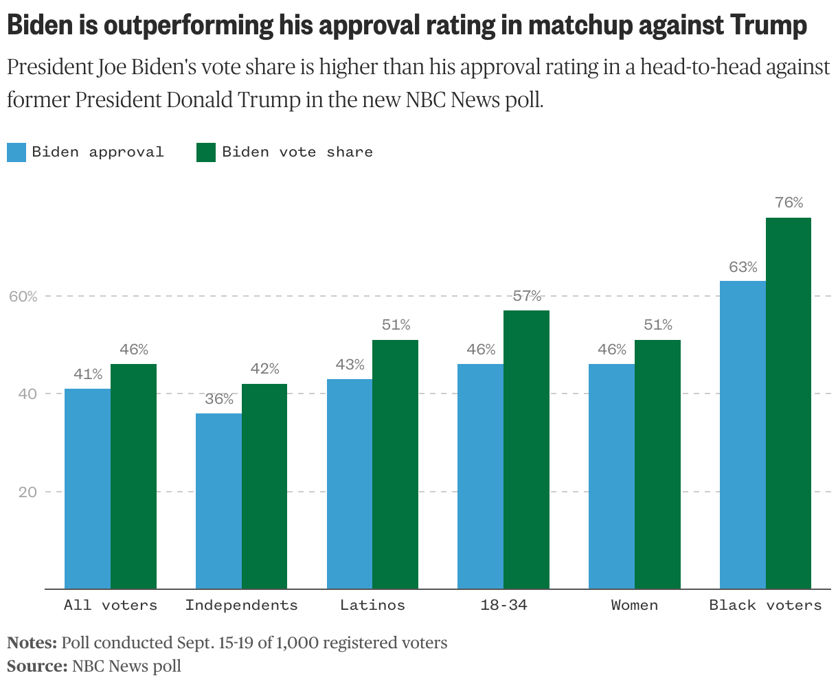 DeSantis and Haley lead the field of non-Trump candidates entering the second debate Ipsos A new 538/Washington Post/Ipsos poll conducted in the week leading up to the second Republican presidential debate finds that former President Trump remains the leader of the pack among likely Republican primary or caucus voters. Biden outperforms his approval rating in a head-to-head matchup with Trump Ben Kamisar, NBC News Biden's approval rating in the new NBC News poll is just 41%, but he wins 46% of the vote in a general election matchup against Trump.